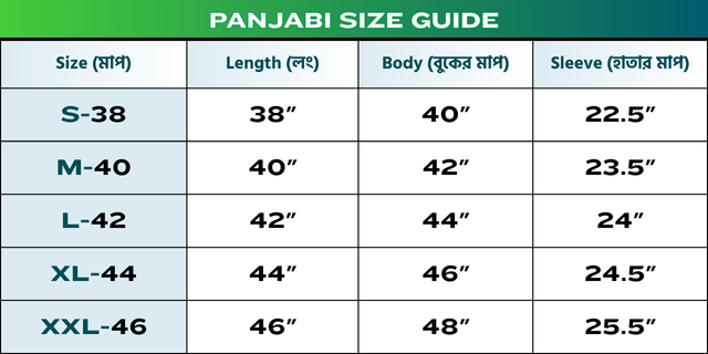 সাইজ: ৩৮, ৪০, ৪২, ৪৪, ৪৬।