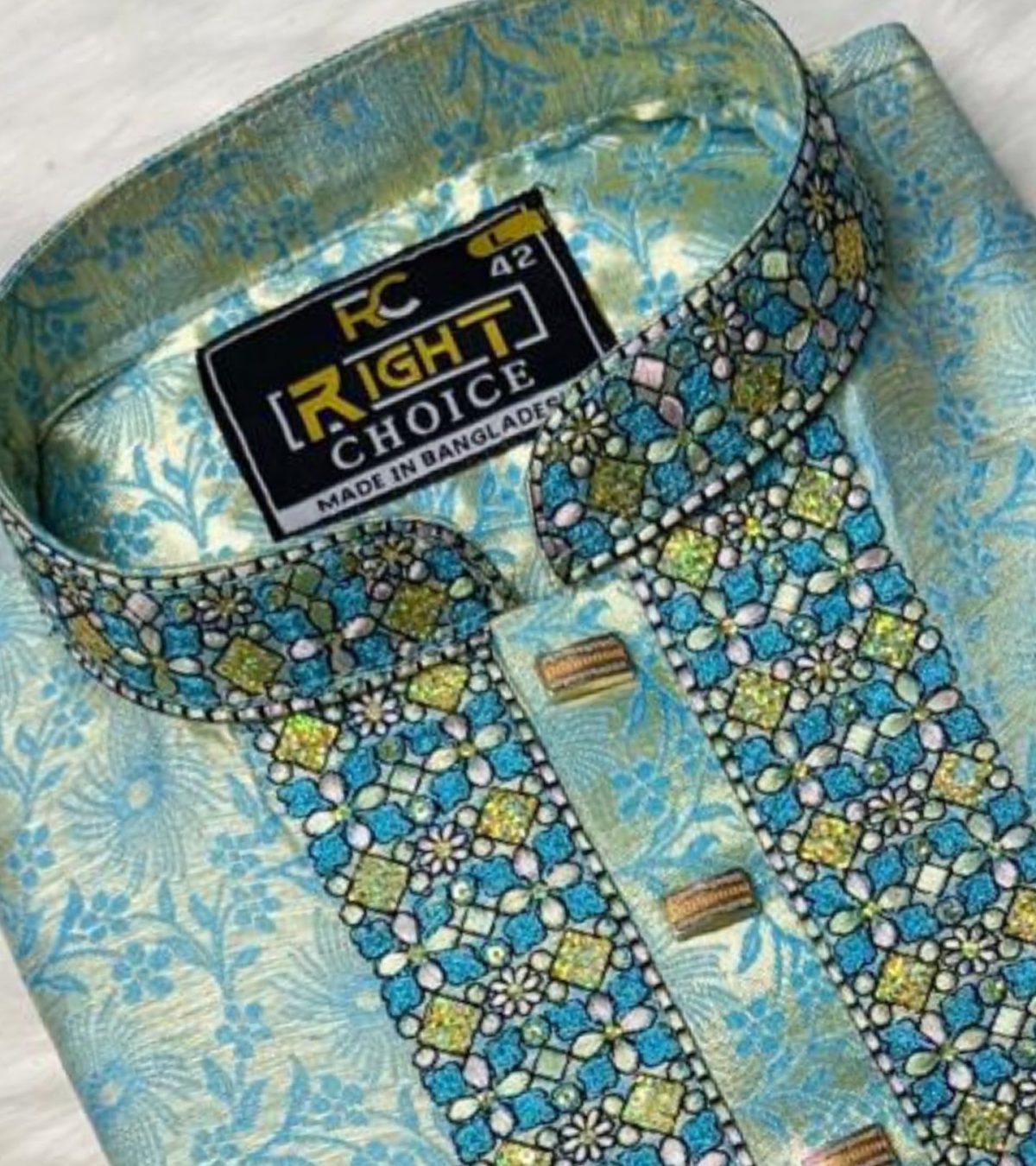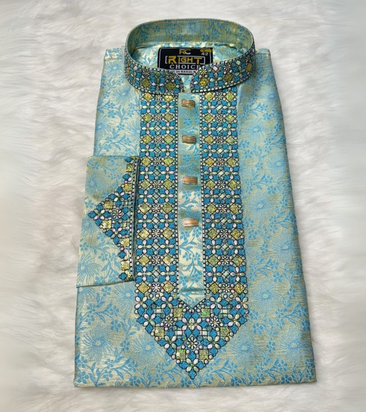 •  ব্যবহার করা হয়েছে উচ্চমানের কাতান ফেব্রিক, যা পরতে আরামদায়ক এবং দেখতে রাজকীয়।