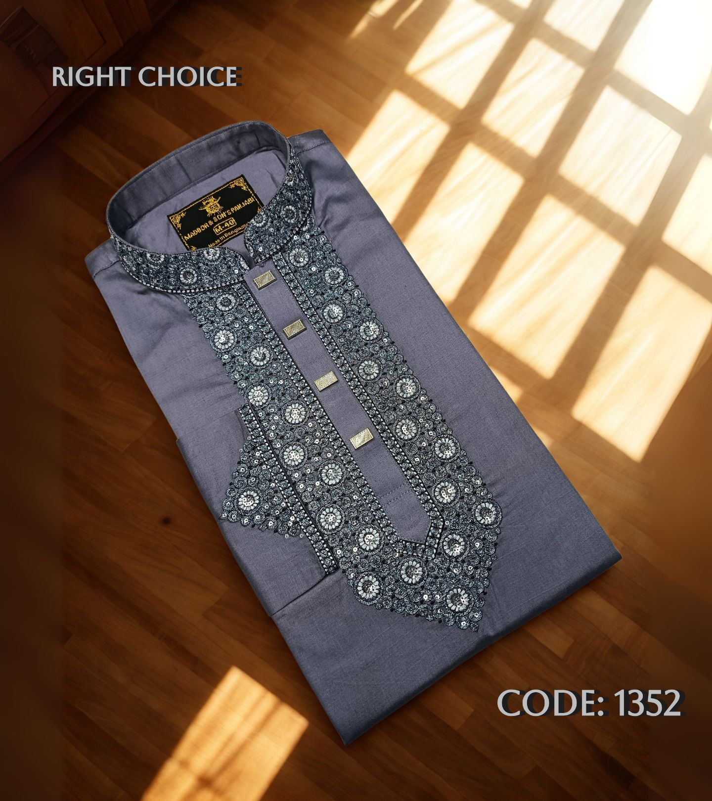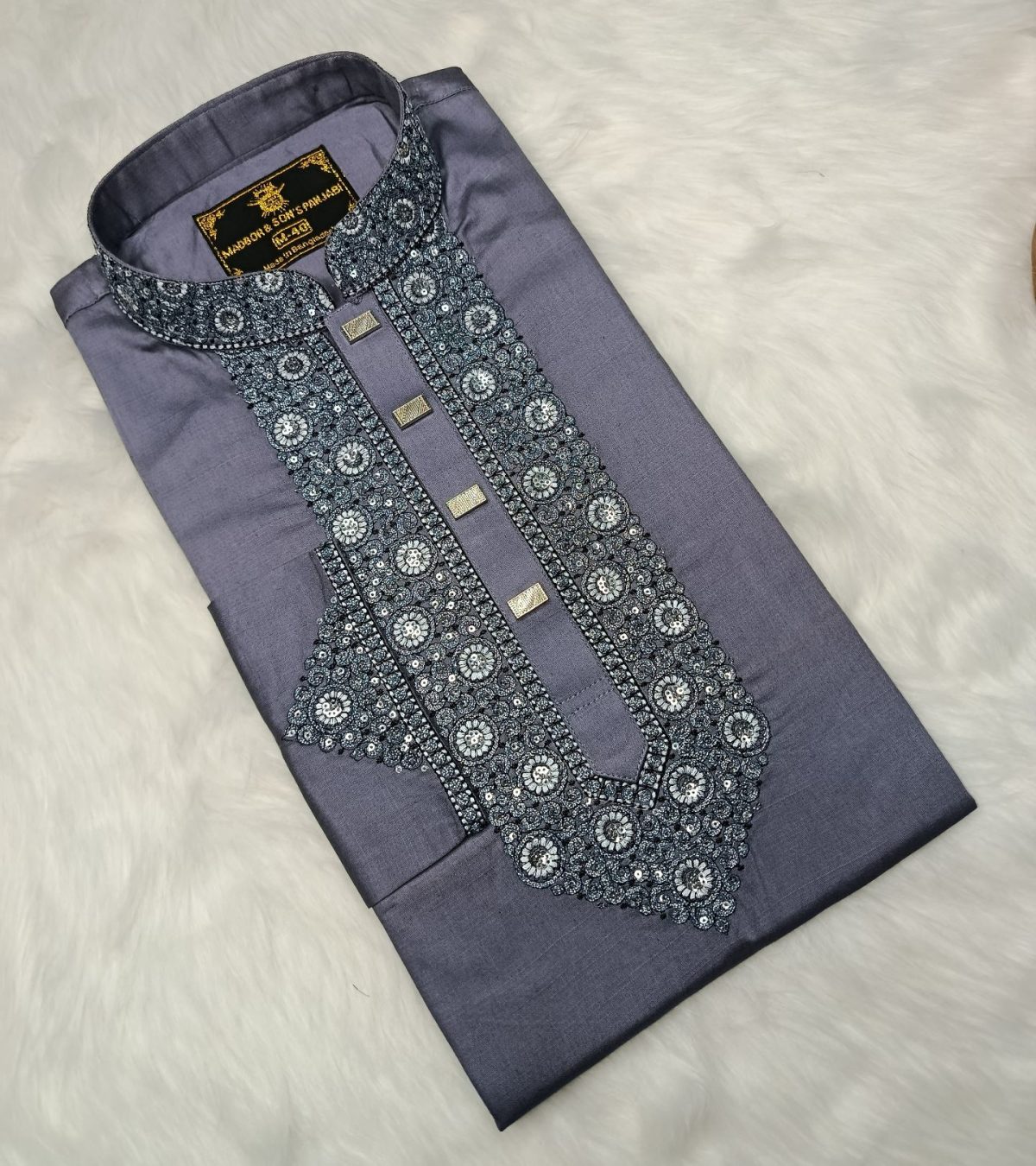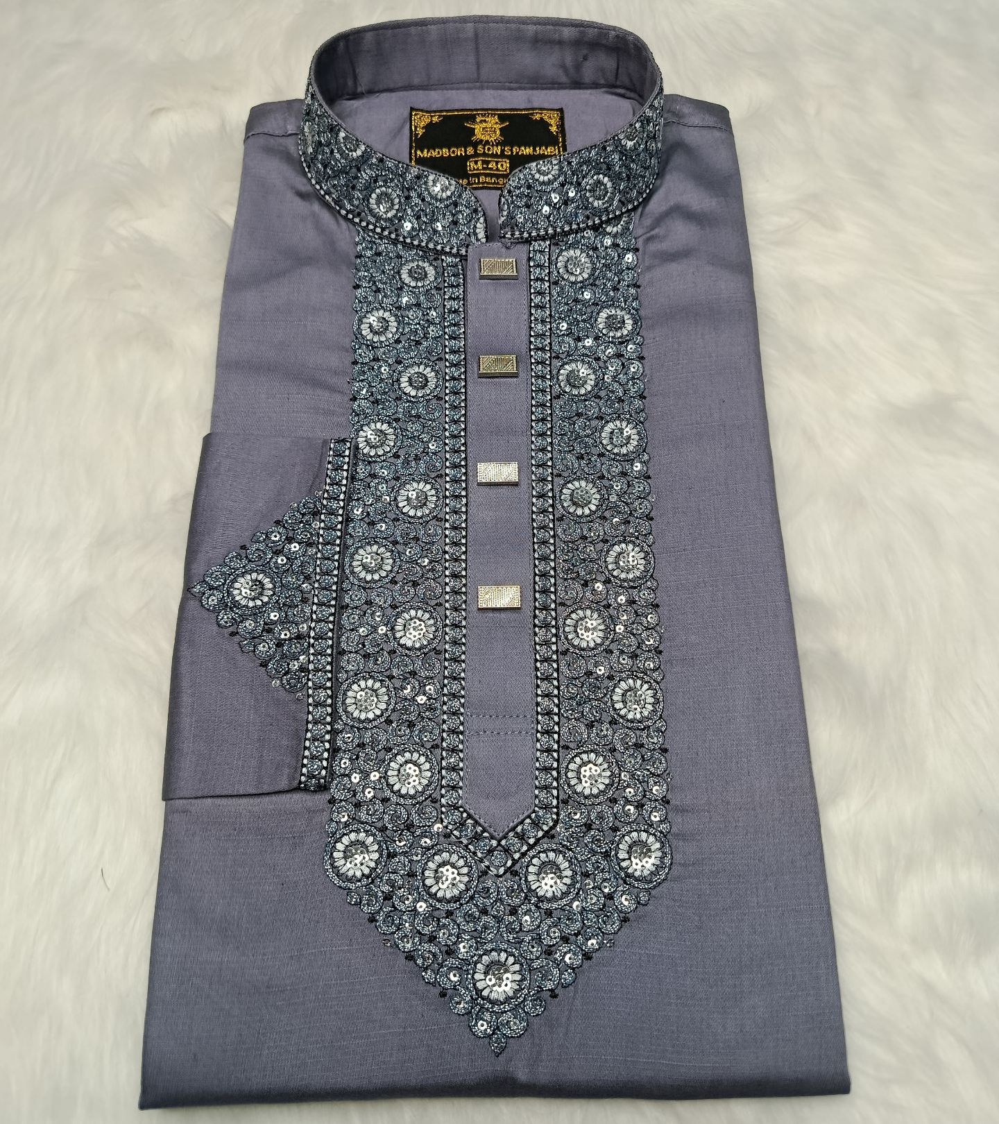 পাঞ্জাবিটি তৈরি করা হয়েছে উন্নতমানের Cotton Fabric-এ, যাতে রয়েছে সূক্ষ্ম ও আকর্ষণীয় Sequence Embroidery কাজ। সঙ্গে ব্যবহার করা হয়েছে ম্যাচিং প্রিমিয়াম Snap Button, যা পুরো লুকে যুক্ত করেছে বাড়তি মান ও সৌন্দর্য।