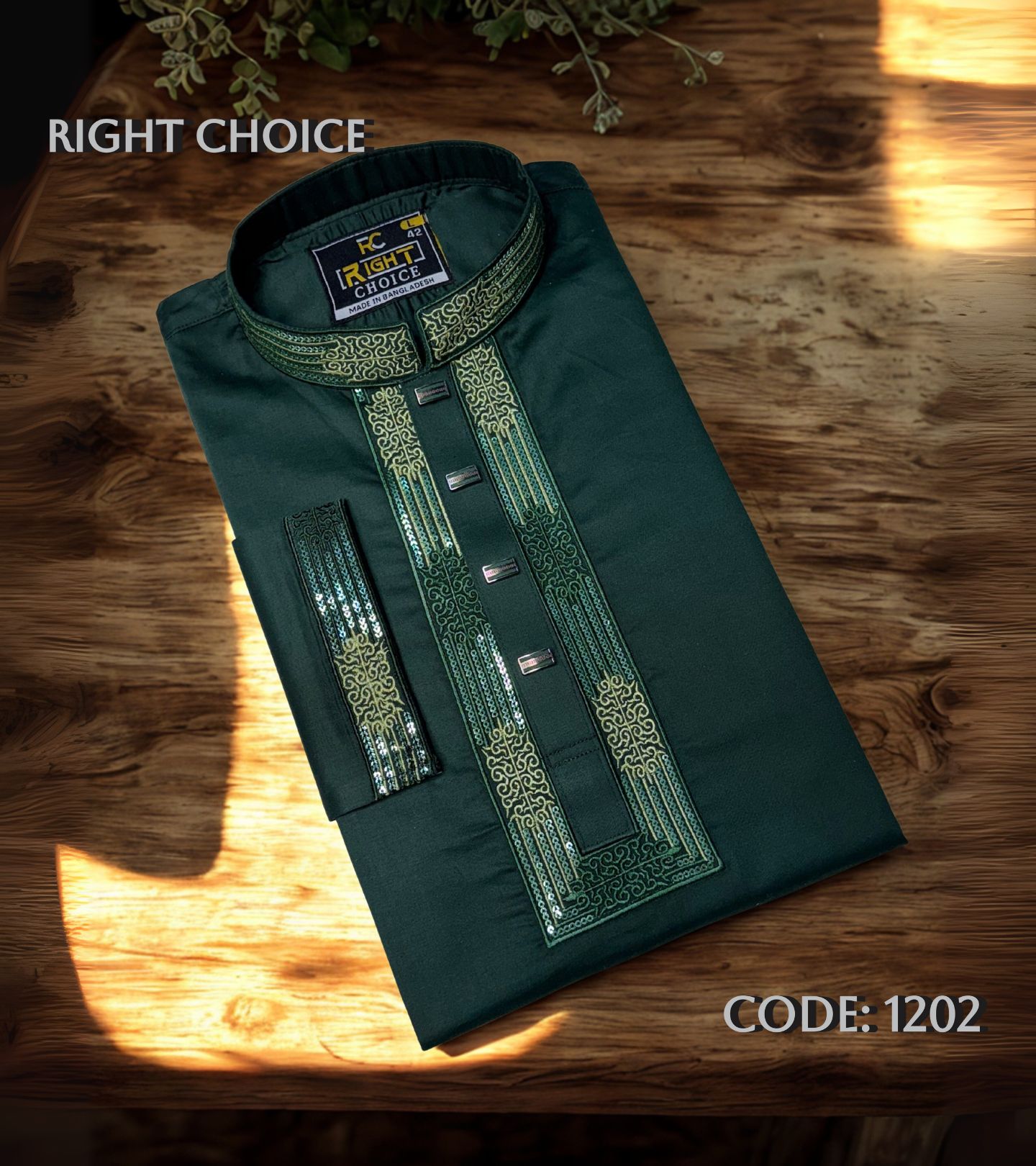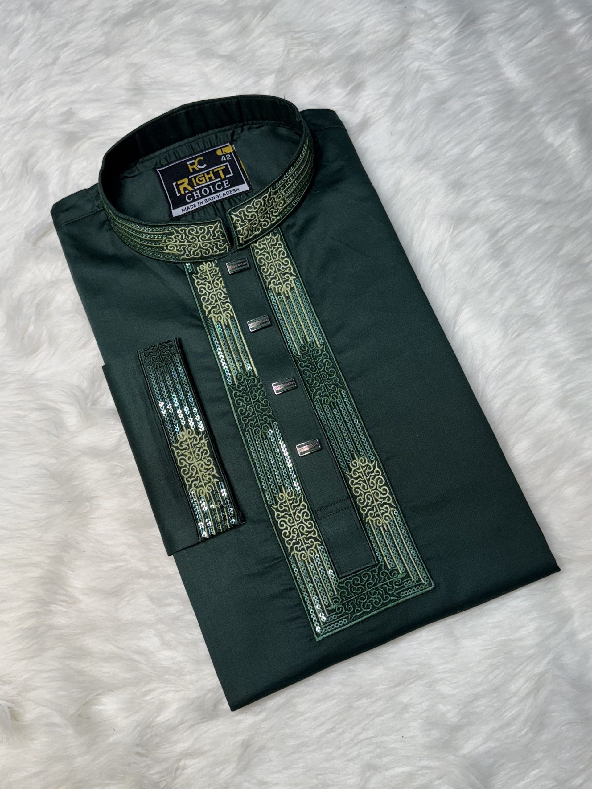 পাঞ্জাবিটি তৈরি করা হয়েছে উন্নতমানের Cotton Fabric-এ, যাতে রয়েছে সূক্ষ্ম ও আকর্ষণীয় Sequence Embroidery কাজ। সঙ্গে ব্যবহার করা হয়েছে ম্যাচিং প্রিমিয়াম Snap Button, যা পুরো লুকে যুক্ত করেছে বাড়তি মান ও সৌন্দর্য।