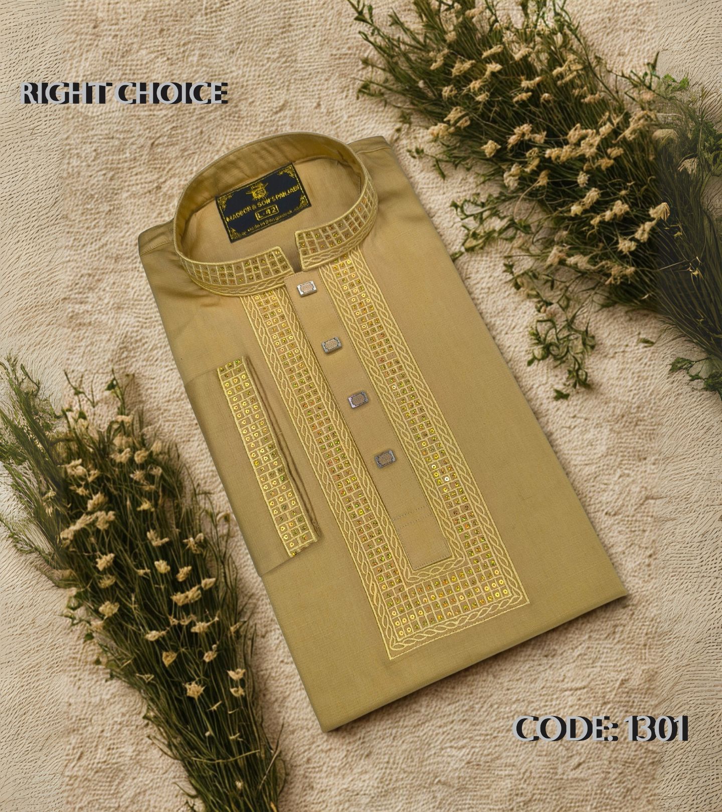 পাঞ্জাবিটি তৈরি করা হয়েছে উন্নতমানের Cotton Fabric-এ, যাতে রয়েছে সূক্ষ্ম ও আকর্ষণীয় Sequence Embroidery কাজ। সঙ্গে ব্যবহার করা হয়েছে ম্যাচিং প্রিমিয়াম Snap Button, যা পুরো লুকে যুক্ত করেছে বাড়তি মান ও সৌন্দর্য।