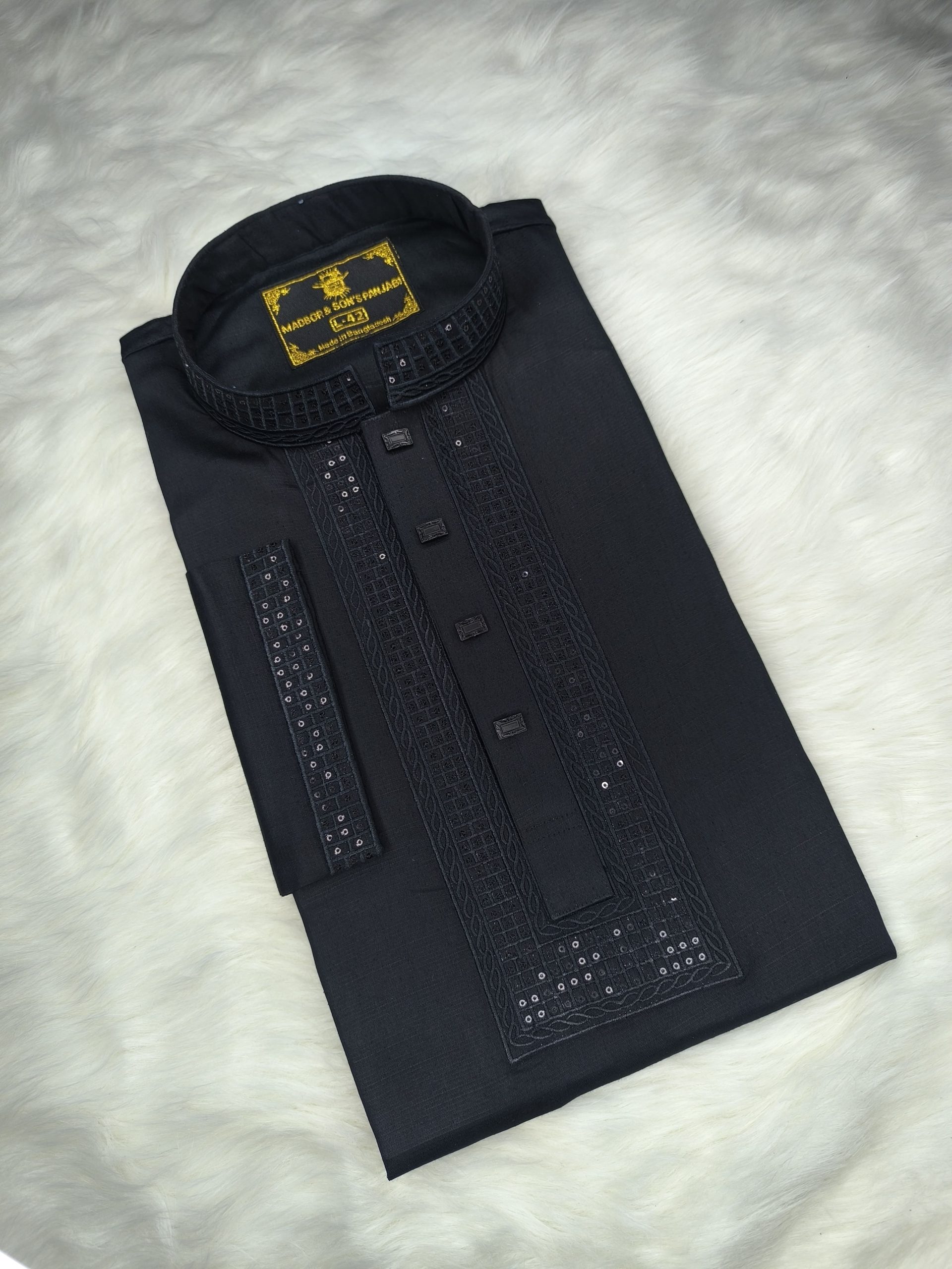 পাঞ্জাবিটি তৈরি করা হয়েছে উন্নতমানের Cotton Fabric-এ, যাতে রয়েছে সূক্ষ্ম ও আকর্ষণীয় Sequence Embroidery কাজ। সঙ্গে ব্যবহার করা হয়েছে ম্যাচিং প্রিমিয়াম Snap Button, যা পুরো লুকে যুক্ত করেছে বাড়তি মান ও সৌন্দর্য।