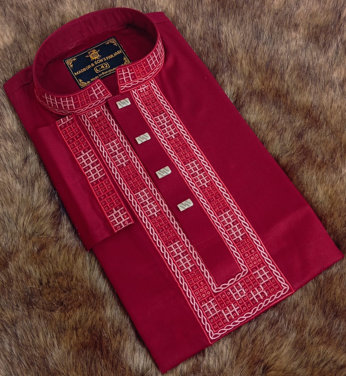 পাঞ্জাবিটি তৈরি করা হয়েছে উন্নতমানের Cotton Fabric-এ, যাতে রয়েছে সূক্ষ্ম ও আকর্ষণীয় Sequence Embroidery কাজ। সঙ্গে ব্যবহার করা হয়েছে ম্যাচিং প্রিমিয়াম Snap Button, যা পুরো লুকে যুক্ত করেছে বাড়তি মান ও সৌন্দর্য।